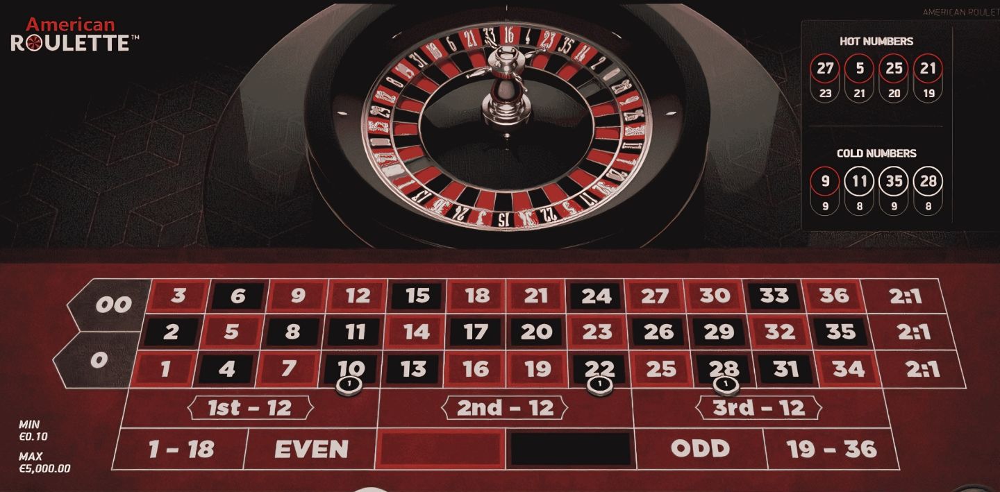 美式轮盘:0、00以及1-36,共38个格子。